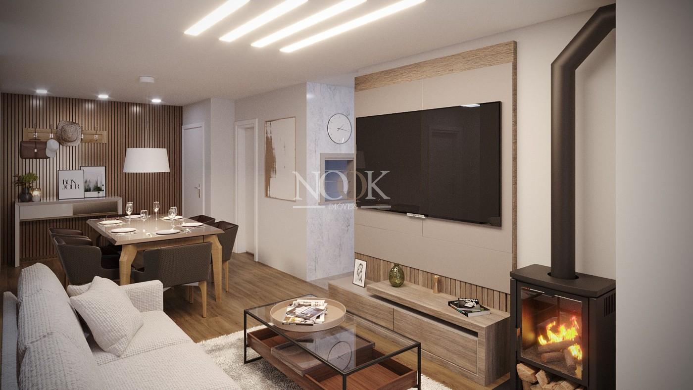 Os diferenciais não param por aí. O projeto já prevê instalações para calefator, lareira e ar-condicionado split, garantindo climatização sob medida. A planta inteligente oferece dois ambientes de convivência perfeito para receber amigos ou criar um cantinho de home office e uma vaga de garagem que facilita a rotina. Na área comum, você conta com academia bem equipada, jardim com paisagismo, playground, espaço kids, quadra poliesportiva e churrasqueira para confraternizações. O elevador, o interfone e o portão eletrônico elevam a sensação de segurança e praticidade.